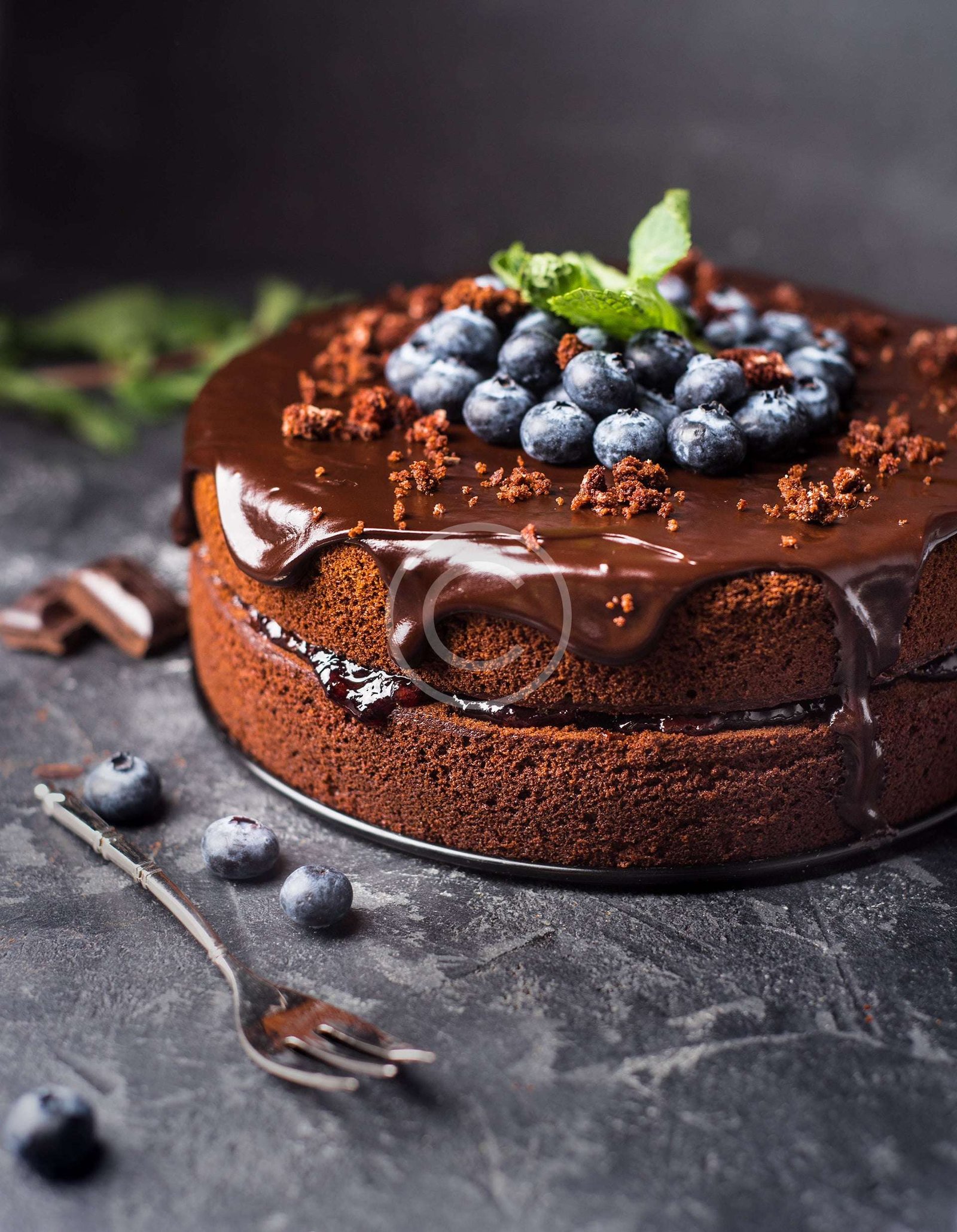 Heavenly delicious chocolate sponge cake with fresh blueberries